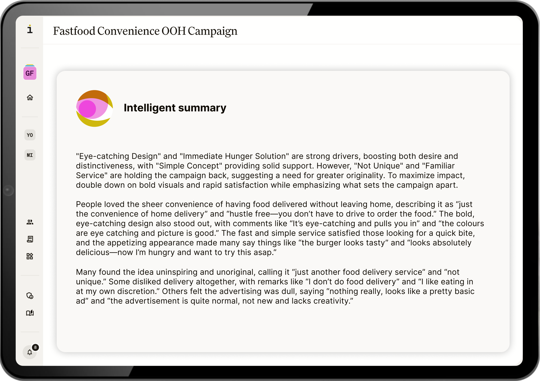 Put creative concepts, campaign territories, or strategic directions in front of real consumers. Get honest, open-ended reactions overnight.