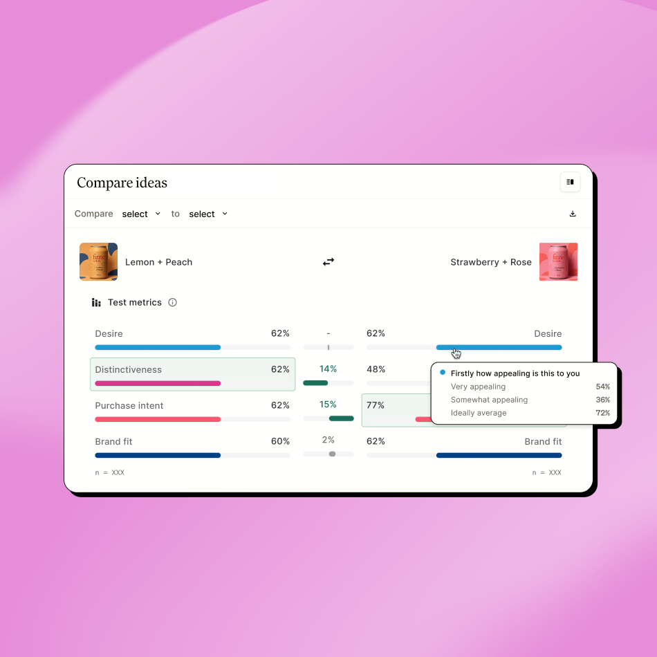 Real consumers. Open-ended responses. Honest reactions. Ideally's AI synthesises everything into themes, tensions, and opportunities. Not just what people think, but why they think it. And what to do next.